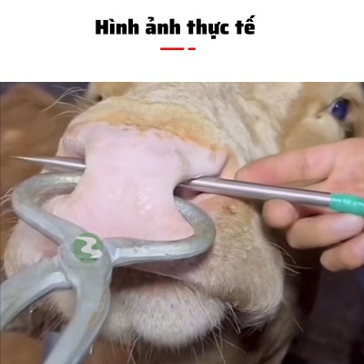 + Đâm cây kim vào mũi bò, thao tác bấm dứt khoát rồi rút ra.