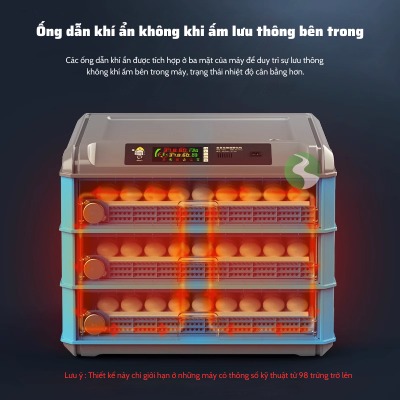 Nó có thể ấp được từ 12 đến 130 quả trứng tùy theo kích cỡ của máy, phù hợp với nhu cầu của các trang trại và hộ gia đình nhỏ.