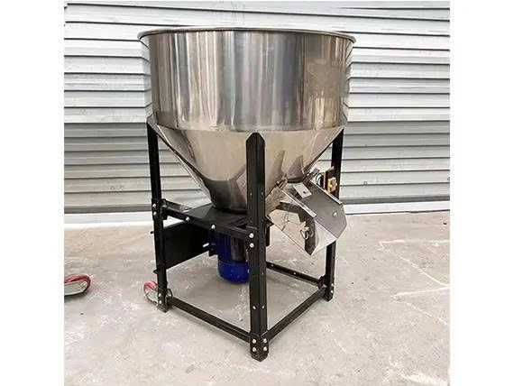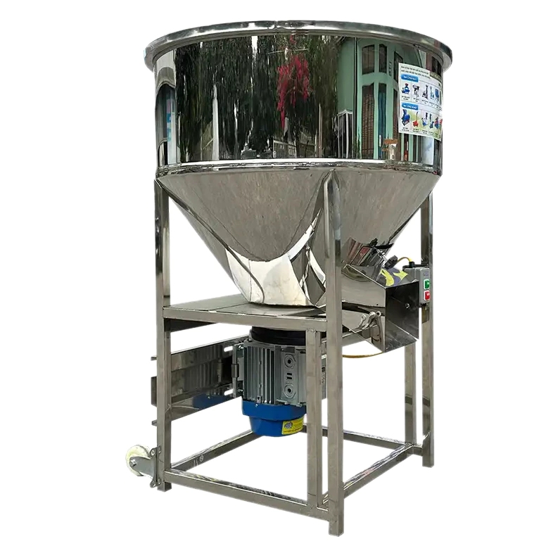 Máy trộn cám trục đứng: Giá rẻ hơn, thời gian trộn nhanh (3-5 phút). Phù hợp trộn các loại cám khô, nguyên liệu dạng bột mịn.